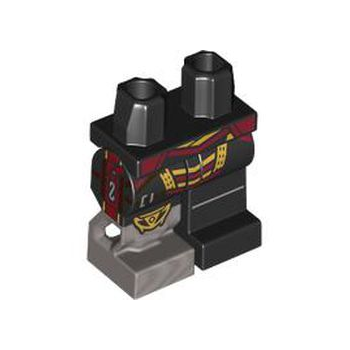 Onderdeel 970d54pb01 - Heupen en 1 zwart linkerbeen, 1 zwart rechterbeen met gegoten platte zilveren prothese en bedrukte donkerbruine band, donkerrode en gouden afwerking, kniebeschermerpatroon